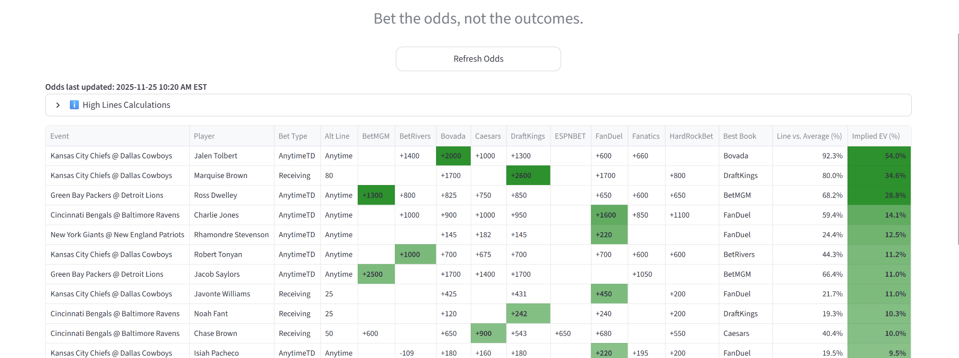 Lines move fast. Our Refresh Odds tool pulls the latest numbers on demand so you’re always looking at current market data.